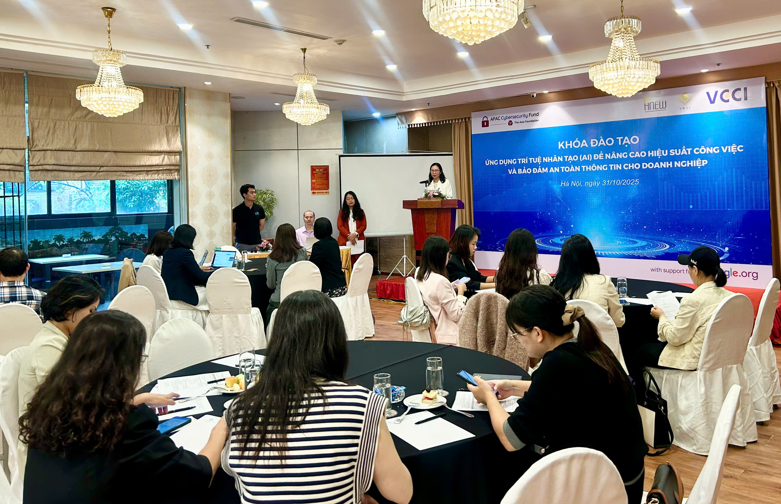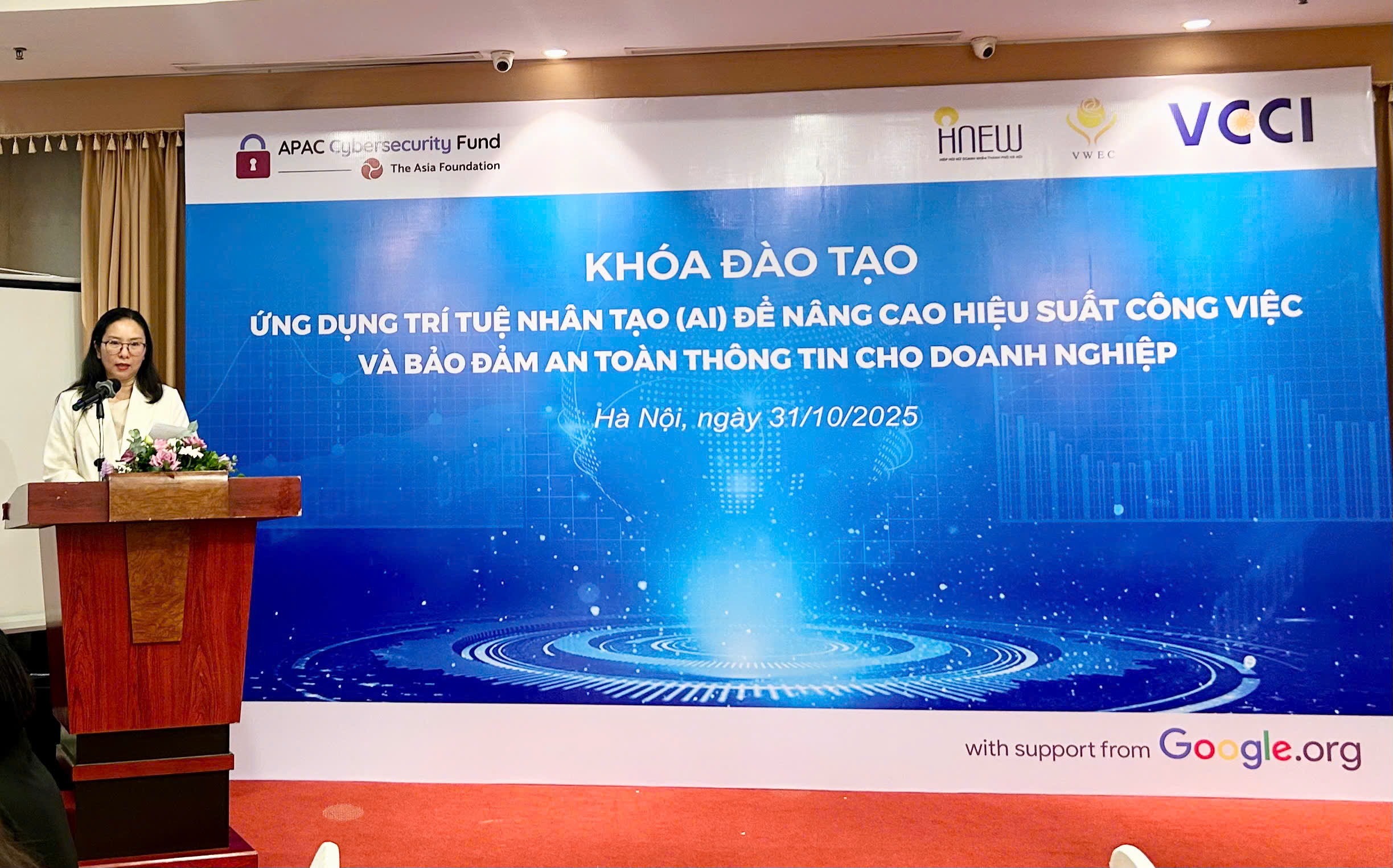 Ngày 31/10, HNEW phối hợp với Hội đồng Doanh nhân nữ Việt Nam, Quỹ Châu Á tổ chức Khóa đào tạo thiết thực về chủ đề ứng dụng AI dành cho Doanh nghiệp nhỏ và vừa (DNNVV) do phụ nữ làm chủ tại Khách sạn La Casa Hà Nội (Hai Bà Trưng, Hà Nội).