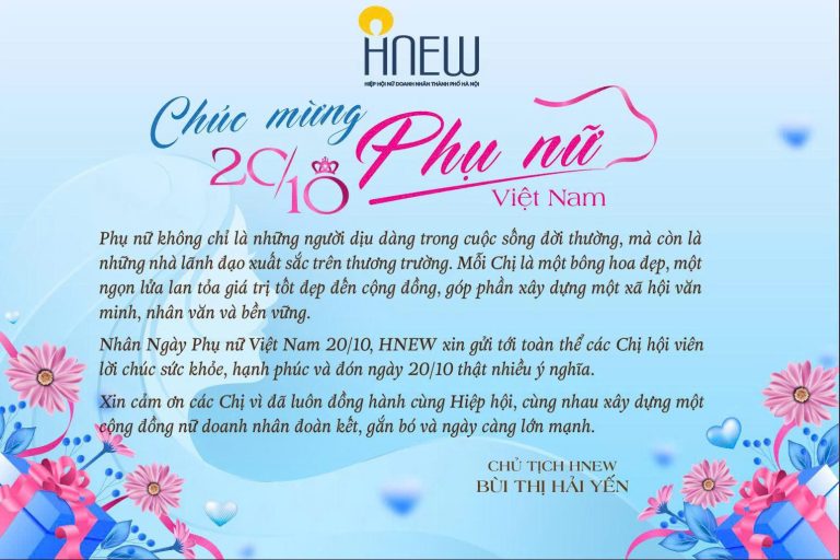 Nhân dịp kỷ niệm Ngày thành lập Hội LHPN Việt Nam, thay mặt Ban Chấp hành HNEW, Chủ tịch Bùi Thị Hải Yến thân ái gửi đến toàn thể chị hội viên lời chúc mừng nồng nhiệt và những tình cảm tốt đẹp nhất.