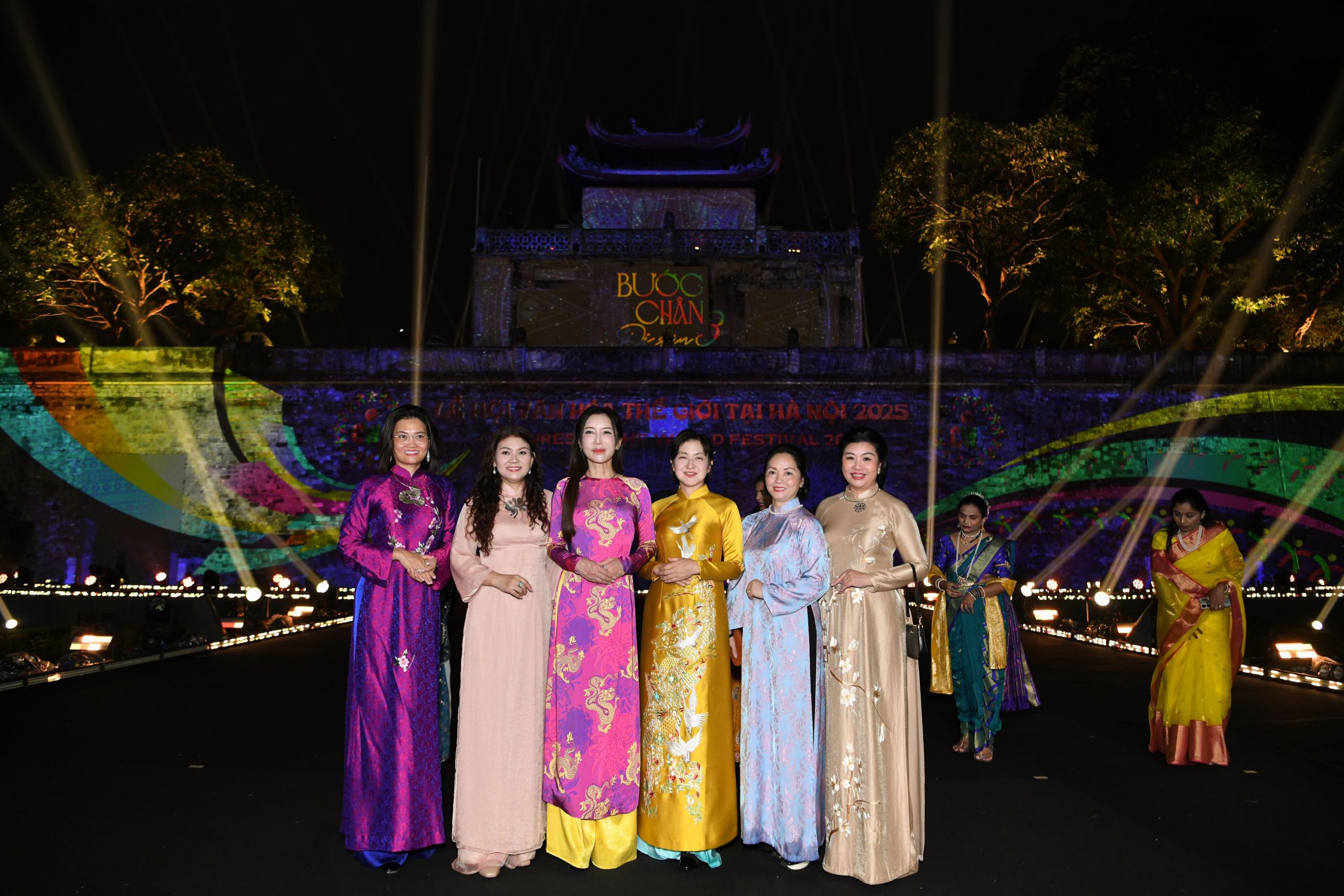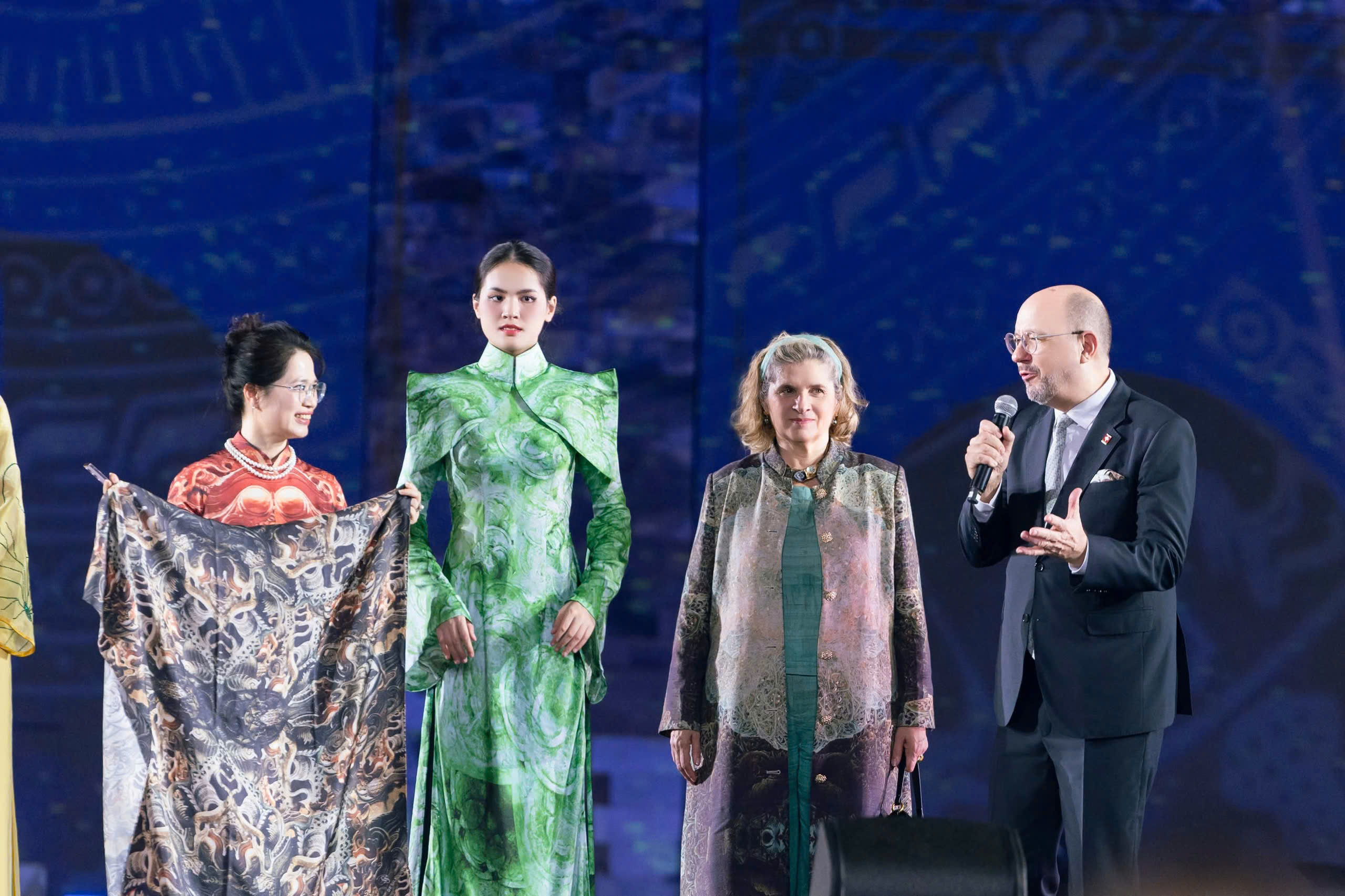 Một điều vô cùng đặc biệt trong “Bước chân Di sản” là màn trình diễn của 4 vị phu nhân Đại sứ Séc, Nhật Bản, Ukraine và Mỹ với BST “Heritage in Hà Nội” của NTK Anh Thư, thương hiệu Áo dài Ngân An – là sự kết nối giữa truyền thống và hiện đại. Mỗi thiết kế của NTK Anh Thư cho các vị phu nhân Đại sứ đều có là sự kết hợp vô cùng tinh tế giữa vẻ đẹp mềm mại của áo dài Việt Nam và những trang trí mang đặc trưng văn hóa đến từ quê hương của các vị phu nhân, tạo nên sự giao thoa văn hóa vô cùng đặc sắc.