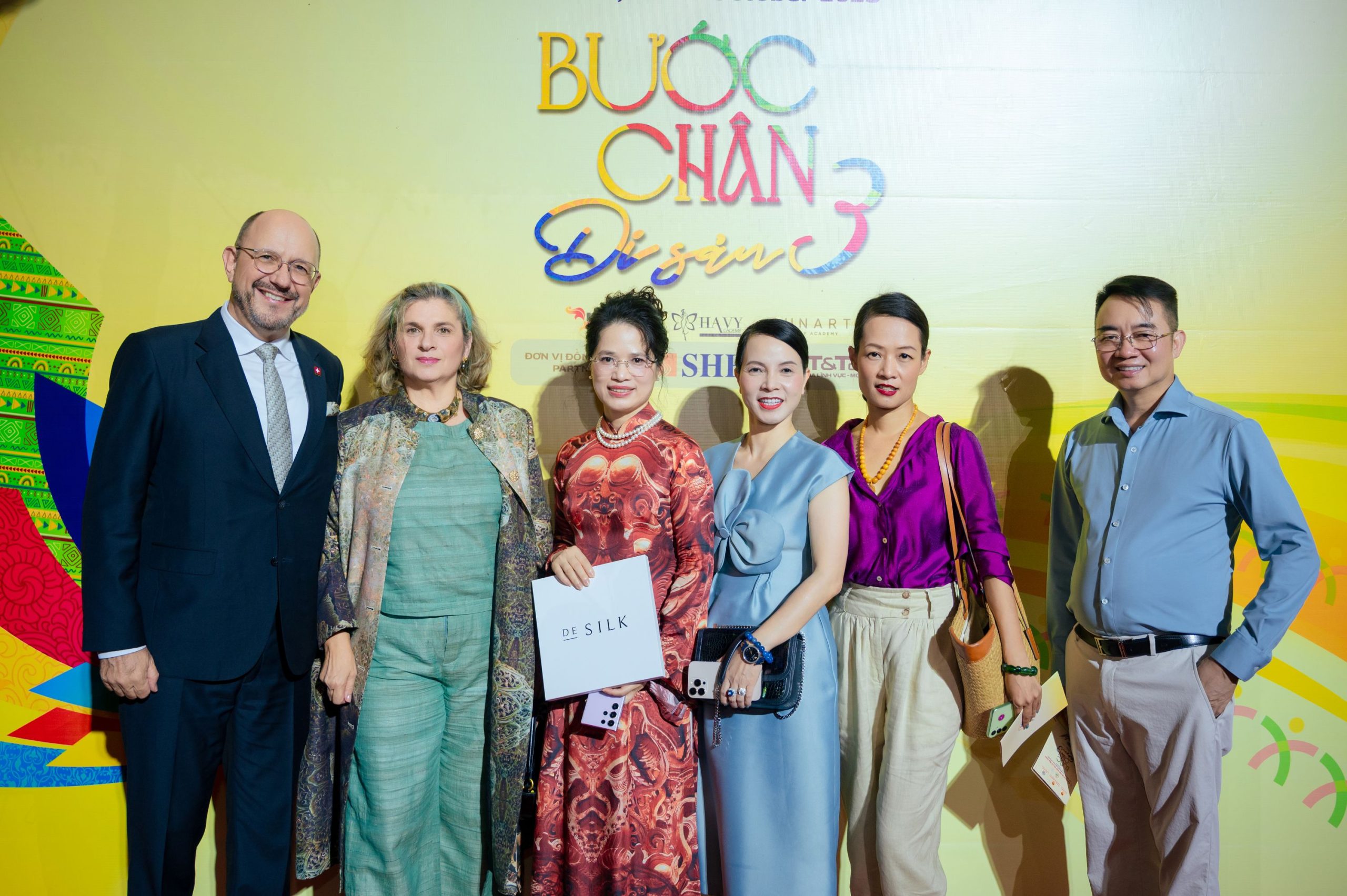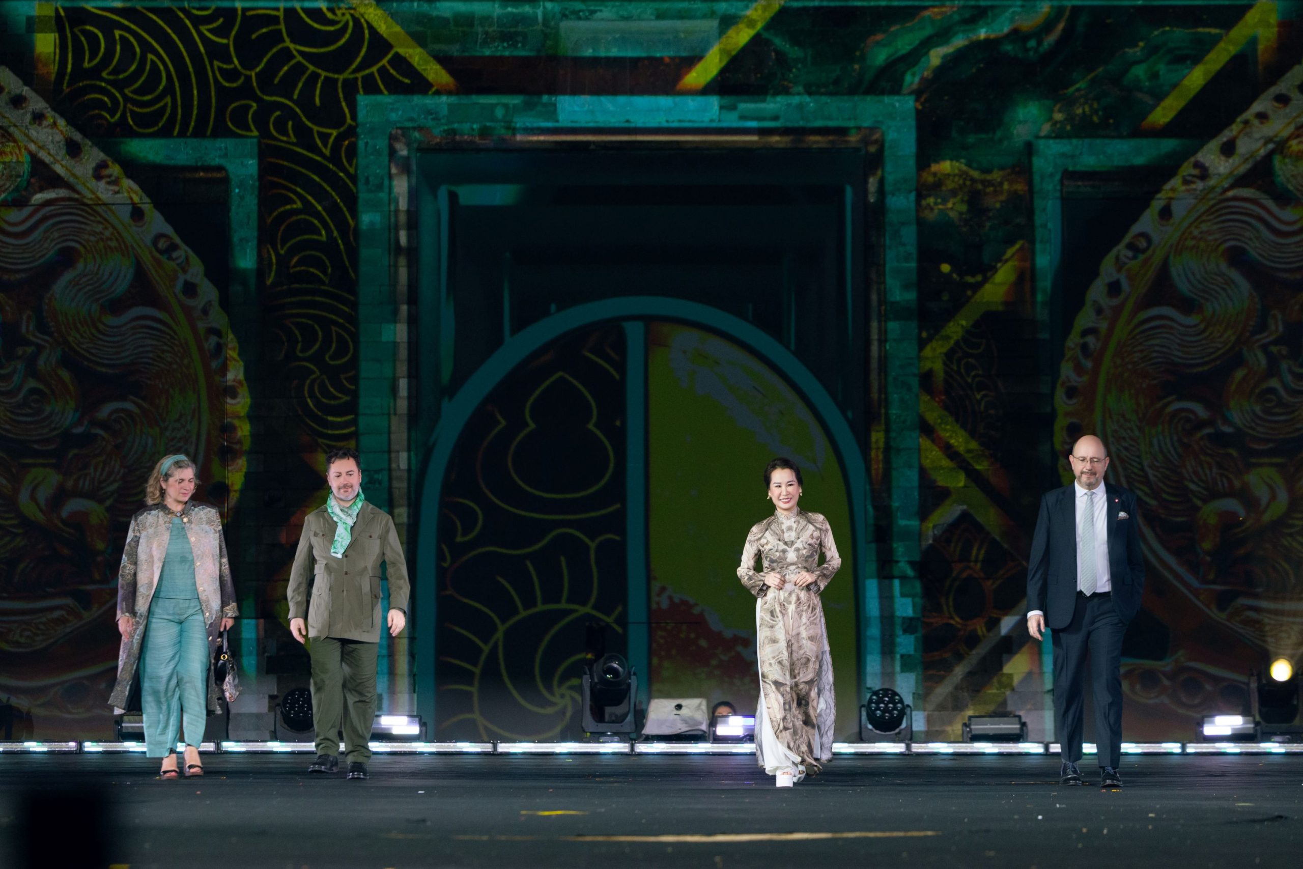 Khoảnh khắc đặc biệt của “Bước chân Di sản” được tiếp nối khi những người bạn quốc tế và nghệ sĩ Việt cùng sải bước trên nền lụa DeSilk qua BST Thăng Long – Dấu thời gian, mang theo thông điệp của tình hữu nghị, của vẻ đẹp vượt thời gian. BST là lời thì thầm giữa quá khứ và hiện tại, là dấu vết xưa được chuyển ngữ bằng lụa trong thời đại hôm nay. Từ hành trình khám phá Hoàng Thành Thăng Long, NTK Văn Hằng mong muốn đem tới một cách nhìn mới cho người thưởng lãm rằng: “Thời gian không làm mờ đi di sản – mà chính là lớp men làm nó rực rỡ hơn bao giờ hết.”
