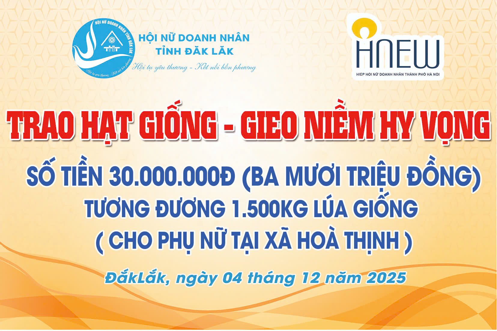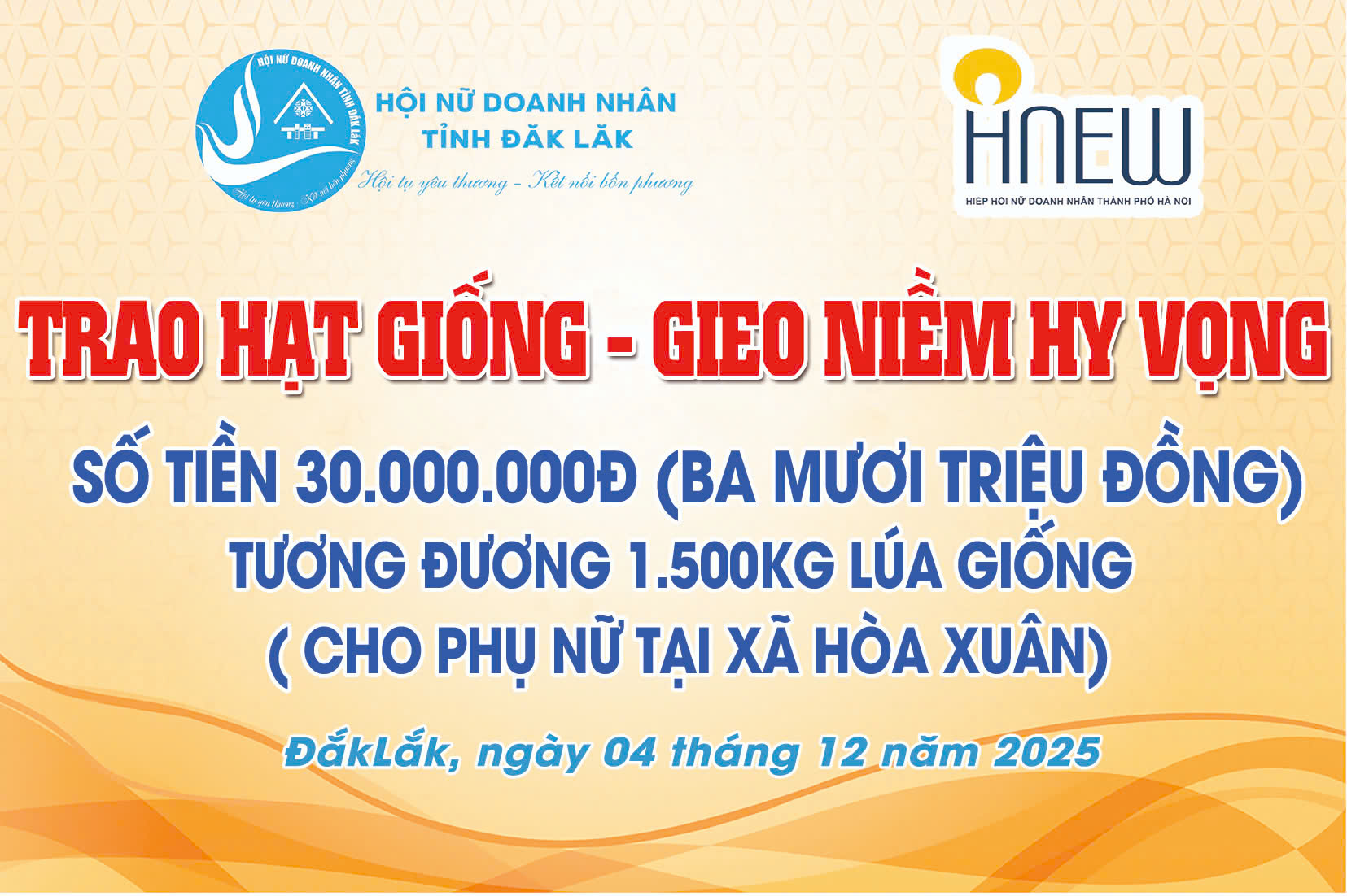 Trước những diễn biến phức tạp do bão lụt gây ra, nhằm lan tỏa tinh thần tương thân tương ái, HNEW đã tiếp tục ủng hộ 60 triệu đồng thông qua Hội Nữ Doanh nhân tỉnh Đắk Lắk để mua giống lúa mới cho phụ nữ 2 xã Hòa Thịnh và xã Hòa Xuân (Tỉnh Phú Yên cũ). Mỗi xã được ủng hộ 30 triệu đồng cho 20 hộ, tương ứng mỗi hộ là 1,5 triệu đồng (tương đương 5 sào/ hộ).